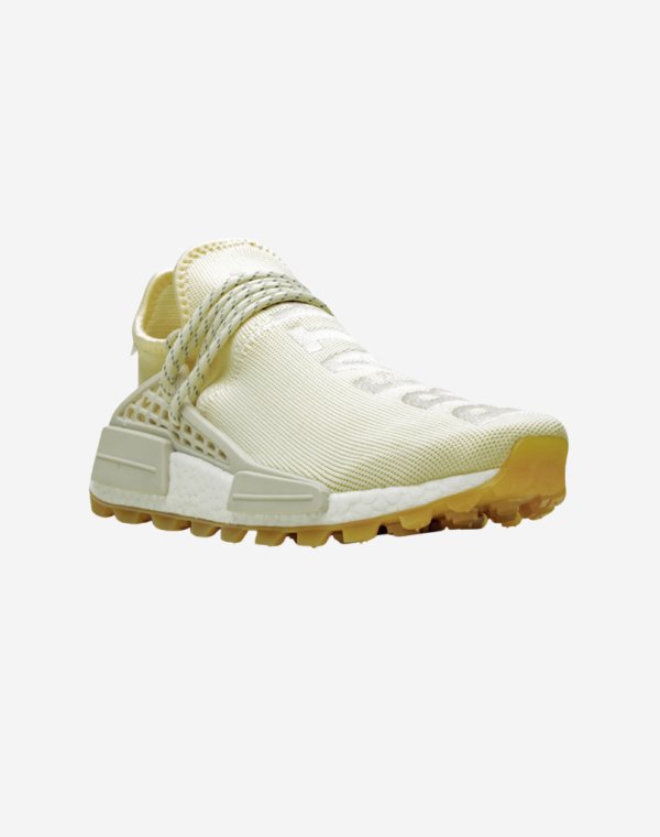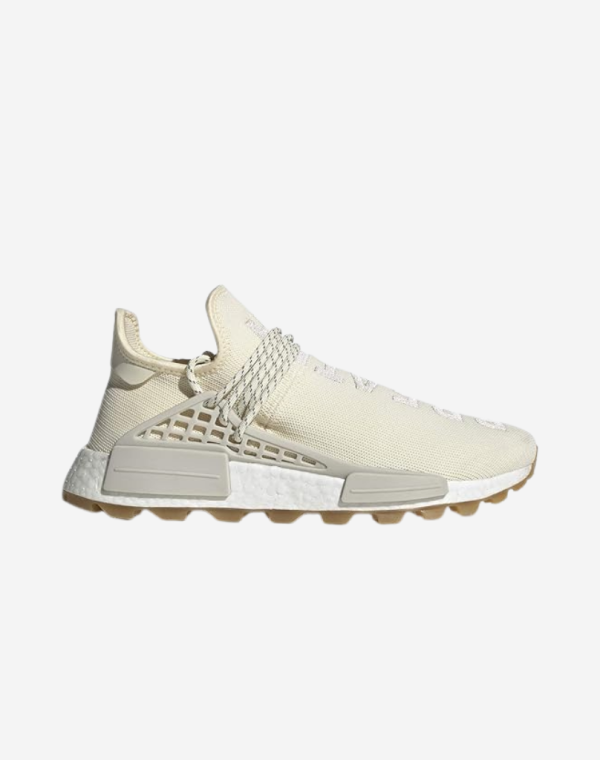 This adidas NMD Hu Trail Pharrell Now Is Her Time Cream White features a Cream White, Raw White, and Gum Three knitted fabric upper, with the Cream White composing the majority of the palette and Raw White making the shade more vibrant at the Boost midsole. From there, plastic tabs merge with the fabric to capture the hiking lacing system of the adidas NMD Hu Trail, and a full, thick tread in gum-colored beige completes the design.
