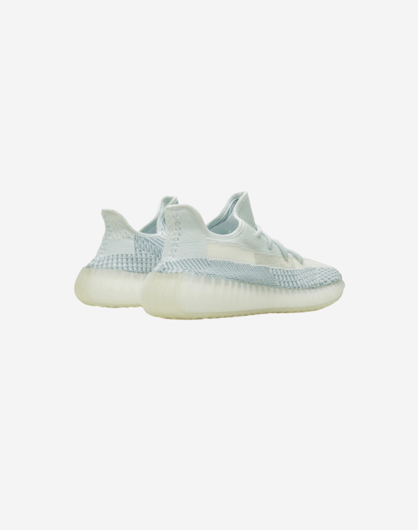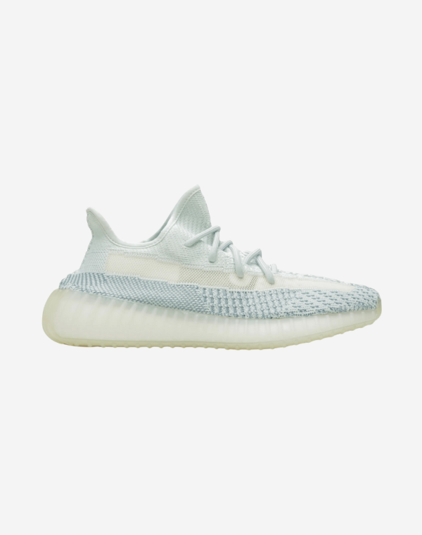 This adidas Yeezy Boost 350 V2 Cloud White (Non-Reflective) combines shades of cream and bluish-white to recreate the hue of a fluffy cloud. A hard sole offers a contrast to the elastic shoelaces and knitted fabric upper. Instead of separate overlays, the upper has the appearance of a single stitched-together piece. One side of the sneaker offers a transparent strip, and the other highlights the blue-and-white patterns. The adidas Yeezy Boost 350 V2 Cloud White (Non-Reflective) uses Primeknit to create a woven textile appearance.
